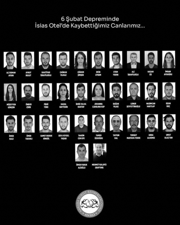 6 Şubat depremlerinde yaşamını yitiren tüm vatandaşlarımızı; İsias Otel’de hayatını kaybeden rehber meslektaşlarımızı ve araç kaptanımızı sevgi, saygı ve özlemle anıyoruz. Kaybettiklerimizi unutmayacak, anılarını daima yaşatacağız.