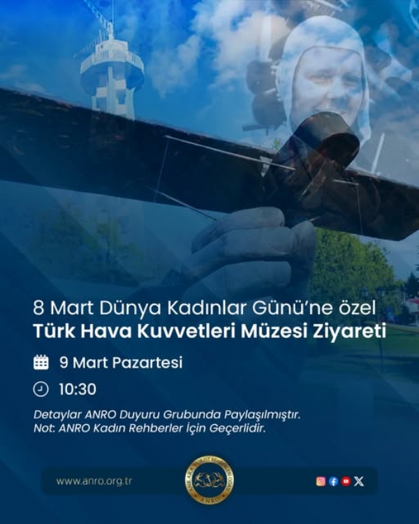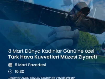 8 Mart Dünya Kadınlar Günü’ne özel Türk Hava Kuvvetleri Müzesi ziyareti gerçekleştirilecektir. ANRO kadın rehberlerine özel bu etkinlik detayları ANRO WHATSAPP DUYURU grubundan paylaşılmıştır.
